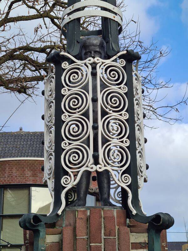 NU: 2022. In de lantaarn zit een jongensfiguur verwerkt. Pas sinds 2012 zit het bronzen jongetje in de lantaarnpaal, binnen het traliewerk. Vanachter de tralies kijkt hij ons aan. Het idee erachter van bedenker Hans van Houwelingen is, dat je even aan het denken wordt gezet. Hij wil het debat aangaan over wat er gebeurt in het leven van kinderen, die door oorlog en natuurgeweld uit hun vertrouwde omgeving gejaagd worden.