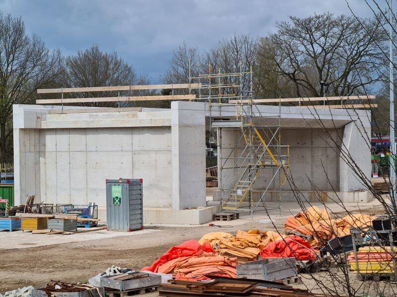 In 2024 zijn de hier opgebouwde tunneldelen verplaatst naar het spoor en is het terrein weer vrijgekomen. Er is hier een fiets- en looproute gepland naar de noordelijke uitgang van de nieuwe spoortunnel. Een tijdelijke komt er in 2025, een definitieve in 2026. Actuele foto's: (c) Allard Bijlsma.