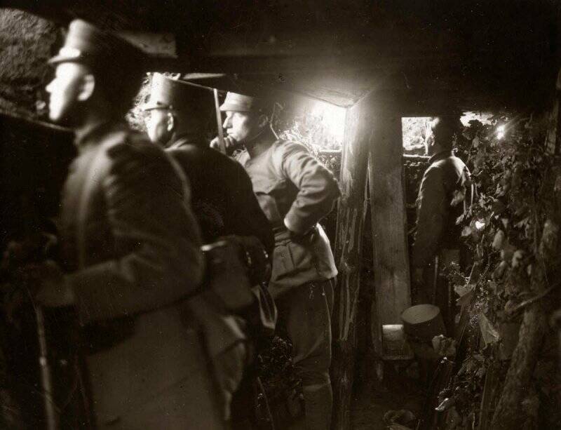 In troepjes stroomen onze veldgrauwen, de hoofden met de platte helmen als ijzeren schildjes afgedekt, het terrein af. Dan volgen wij overste Meyberg, die ons nu door de veroverde loopgraven zal voeren. Eerst stappen we over 'niemandsland', het zoogenaamde trechterveld tusschen de beide vijandelijke linies. De trechters, door granaatontploffingen gevormd, zijn hier nogal bescheiden wan omvang, de origineele op het westelijk front hebben vaak een omtrek van vijftig meter. Allereerst komen we nu aan de uiterste punten die ais voelhoorns naar voren steken, de zoogenaamde 'luisterposten', die hebben uit te kijken naar de aansluipende patrouilles, die het ijzerdraad komen doorknippen en de versperringen opruimen. Elke luisterpost wordt gewoonlijk bezet door zes man.