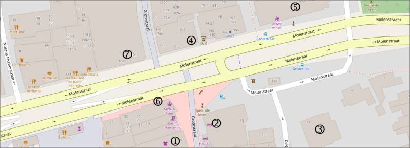 Dit deel van de Molenstraat is nieuw. Hier stond oorspronkelijk geen bebouwing. Kapper Steef is (4) op de kaart.