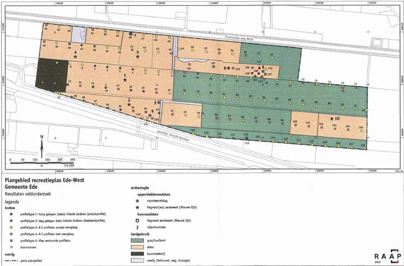 Als voorbereiding op het mogelijk uitgraven is eerst archeologisch onderzoek gedaan. In de kaart is te zien dat er vuurstenen werktuigen en potscherven zijn gevonden. Bron: RAAP 2002.