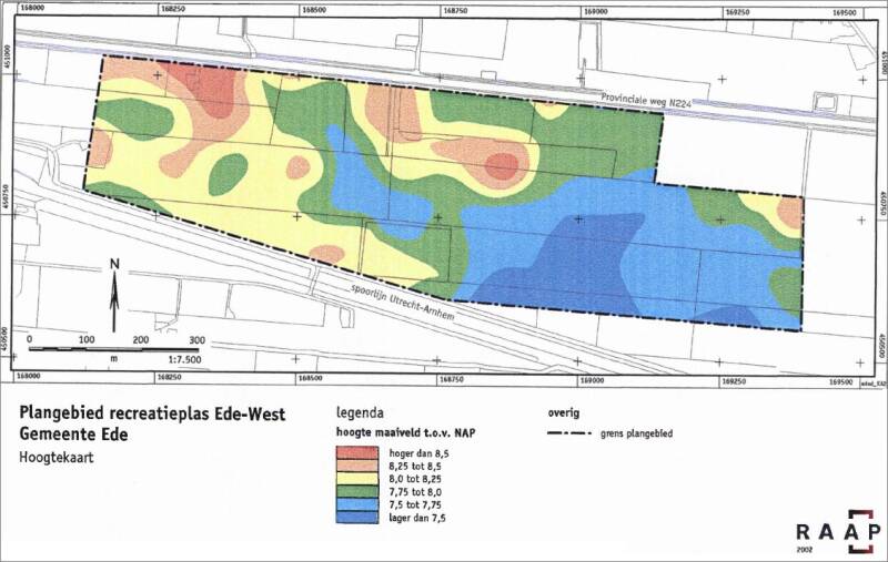 De hoogtekaart laat zien dat er binnen het gebied maximaal een meter hoogteverschil is te vinden. Bron: RAAP 2002.