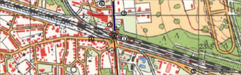 Nummers: (1)= station, (2)= hotel De Witte Hinde, (3)= toegangsweg kazernes, (4)= Parkweg, (5)= ENKA-terrein, (6)= Keetmolen, (7)= cafetaria.