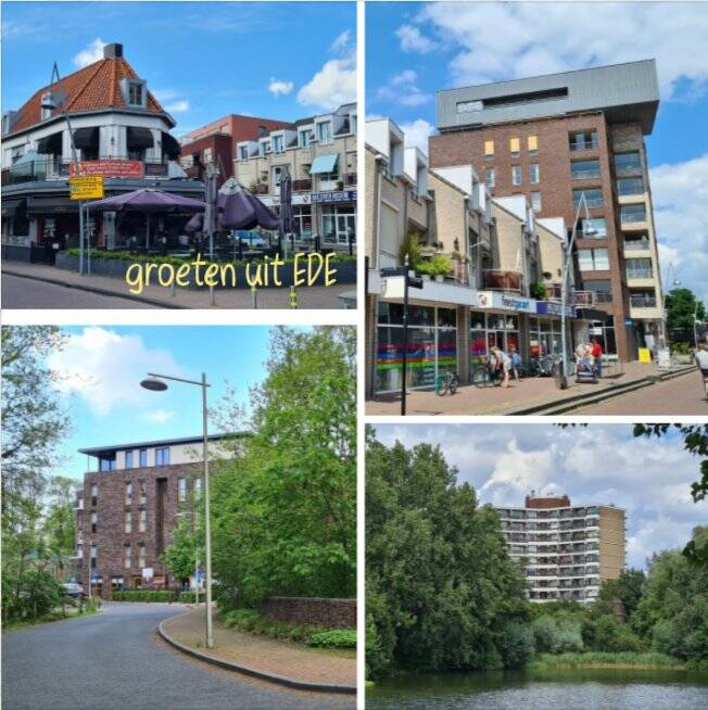Onderstaande NU-collages zijn door mij gemaakt met behulp van deze [ online collagemaker ]. Dit soort kaarten kun je zelf maken, laten afdrukken en naar iemand laten sturen. Ze zijn ook nog wel te koop in Ede bij postagentschappen en boekwinkels. Zoek je een oude ansichtkaart van Ede? Op internet vind je diverse gespecialiseerde antiquariaten hiervoor: [hier], [hier] en [hier]. Alle recente foto's: (c) Allard Bijlsma.