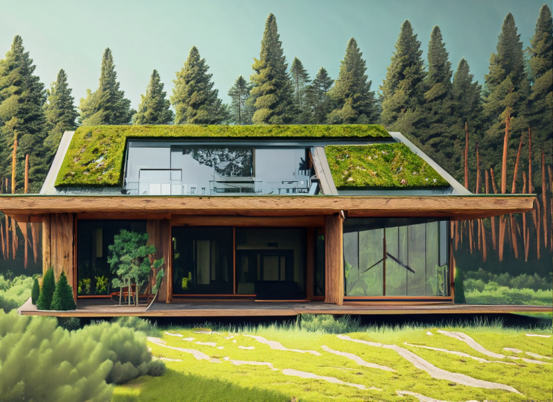 Strook 2: groene gebouwen met maximaal 2 bouwlagen, steeds met een sedumdak | AI-gegenereerd.