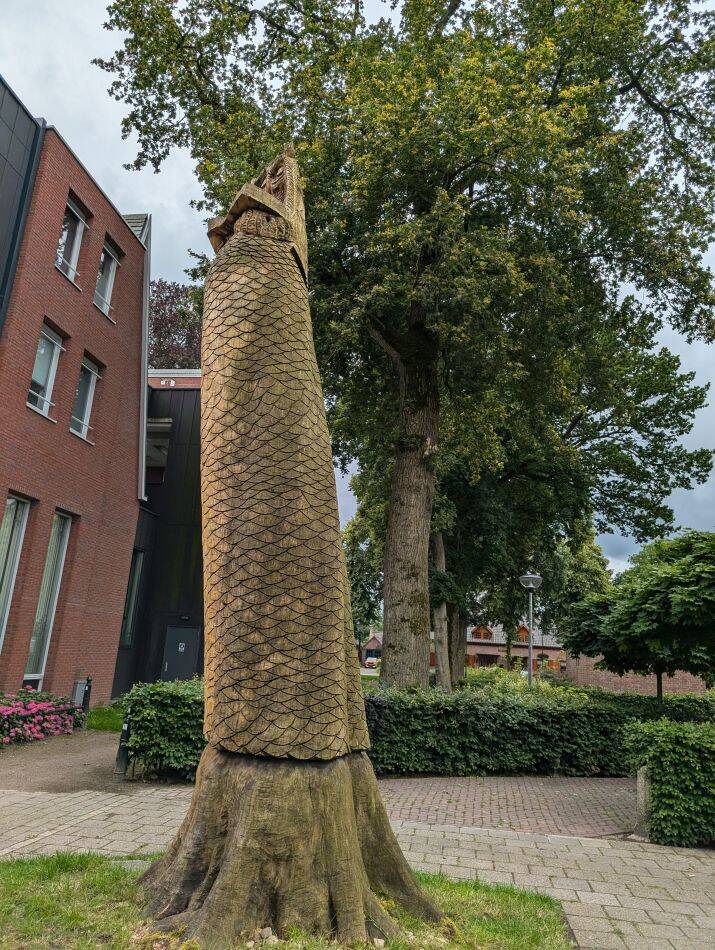 Op het pleintje staan beuken, zomereiken, een gewone en een Noorse Esdoorn en Hollandse lindes. Van één stam is een houtsnijwerk gemaakt. - Neem het pad naast het Westhoffhuis [3] en ga LA via dit pad voorlangs dit pand. Je gaat op deze wijze LA (= Dorpsstraat).