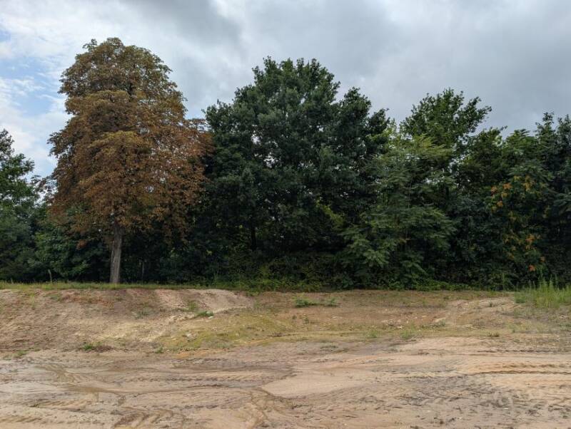 Zicht op de doorsteeklocatie vanaf het Frisopark. Hier staan enkel wat oudere bomen, maar ook veel uitgezaaide hemelbomen. Die laatste kunnen worden opgeruimd. De bestaande bomen blijven zoveel mogelijk staan en je loopt en fietst straks door de bomenkruinen.